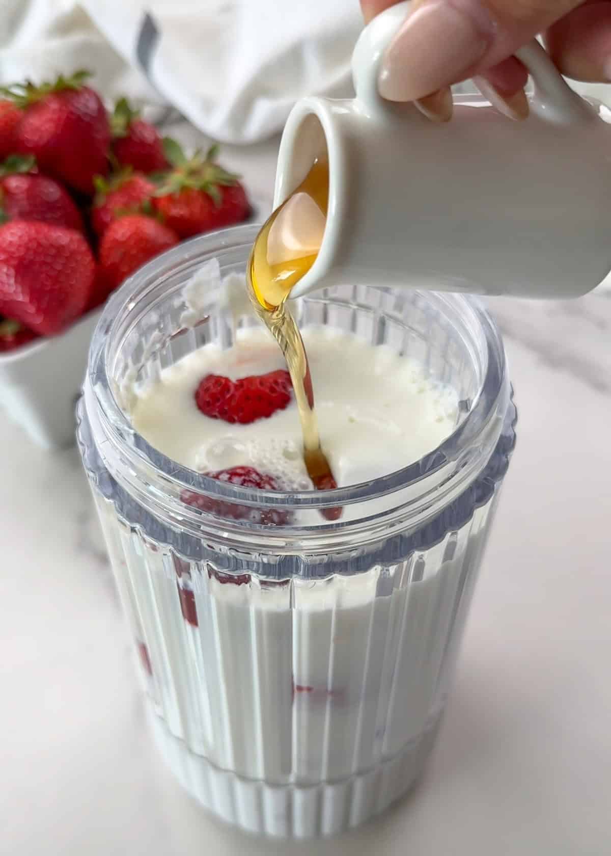 Blend Greek yogurt, strawberries, and milk, then sweeten with honey or agave and a touch of vanilla.
